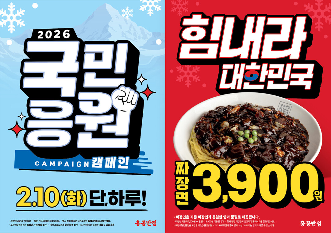 더본코리아의 중식 전문점 브랜드 홍콩반점0410이 겨울 스포츠 축제 시즌을 맞아 ‘힘내라 대한민국 국민응원 캠페인’의 일환으로 오는 2월 10일 하루 동안 짜장면을 3900원에 제공한다고 6일 밝혔다.