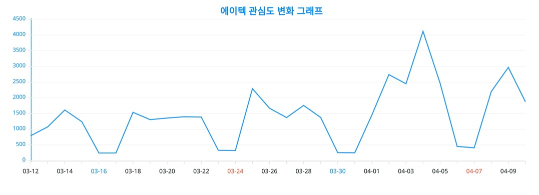 이번 분석을 통해 얻어진 에이텍에 대한 일간 변화 추이 차트는, 에이텍에 대한 관심이 어떻게 변화했는지를 생생하게 드러낸다.