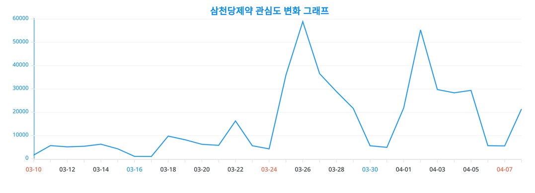 이번 분석을 통해 얻어진 삼천당제약에 대한 일간 변화 추이 차트는, 삼천당제약에 대한 관심이 어떻게 변화했는지를 생생하게 드러낸다.