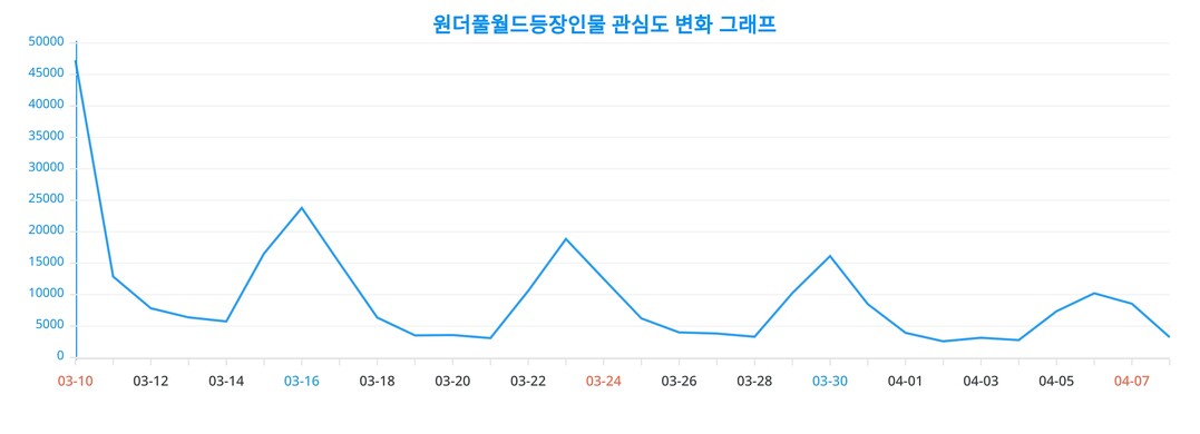 이번 분석을 통해 얻어진 원더풀월드등장인물에 대한 일간 변화 추이를 보여주는 차트는, 각 성별과 연령대별로 얼마나 원더풀월드등장인물에 대한 관심이 변화했는지를 생생하게 드러낸다.