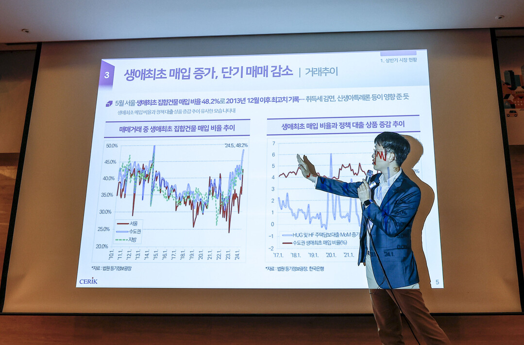 | ▲ 김성환 한국건설산업연구원 부연구위원이 서울 강남구 건설회관에서 열린 ‘2024년 하반기 건설·부동산 경기 전망 세미나’에서 올 하반기 주택 및 부동산 경기 전망을 발표하고 있다. 사진=뉴시스 |