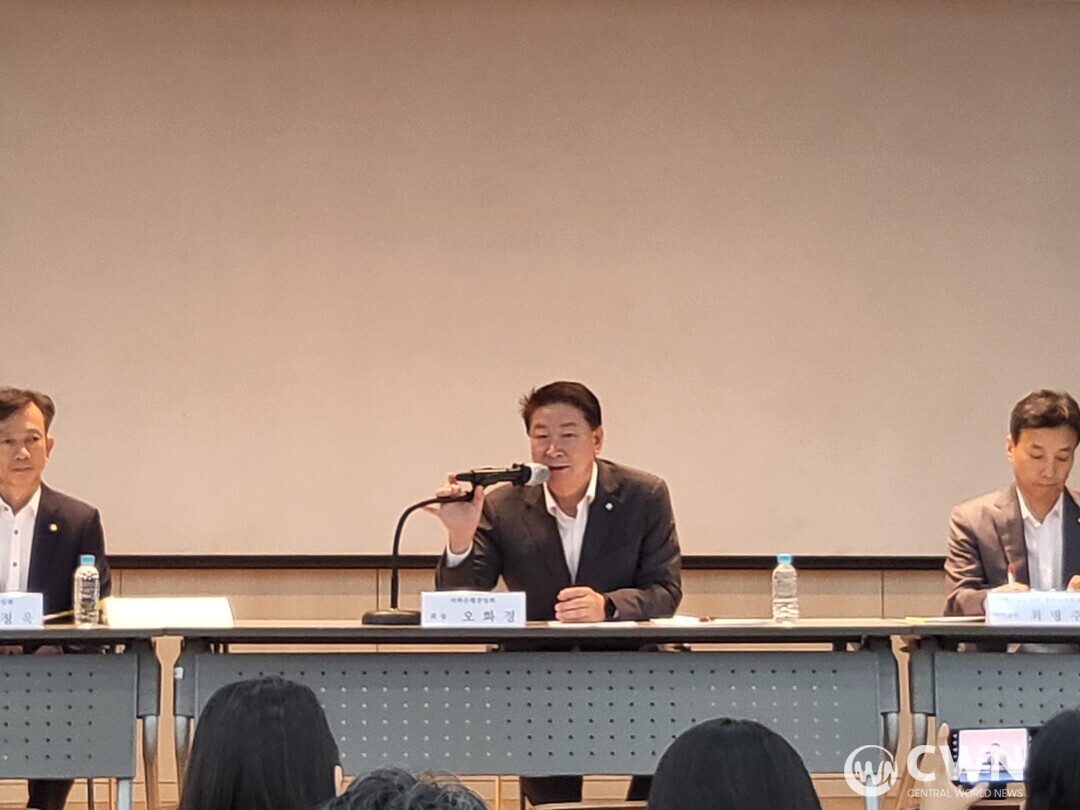 | ▲ 오화경 저축은행중앙회 회장(가운데)이 30일 서울 마포구 본사에서 '2024 2분기 저축은행 결산 결과' 기자 설명회에서 답변하고 있는 모습. 사진=김보람 기자 |