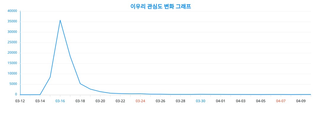 이번 분석을 통해 얻어진 이우리에 대한 일간 변화 추이 차트는, 이우리에 대한 관심이 어떻게 변화했는지를 생생하게 드러낸다.