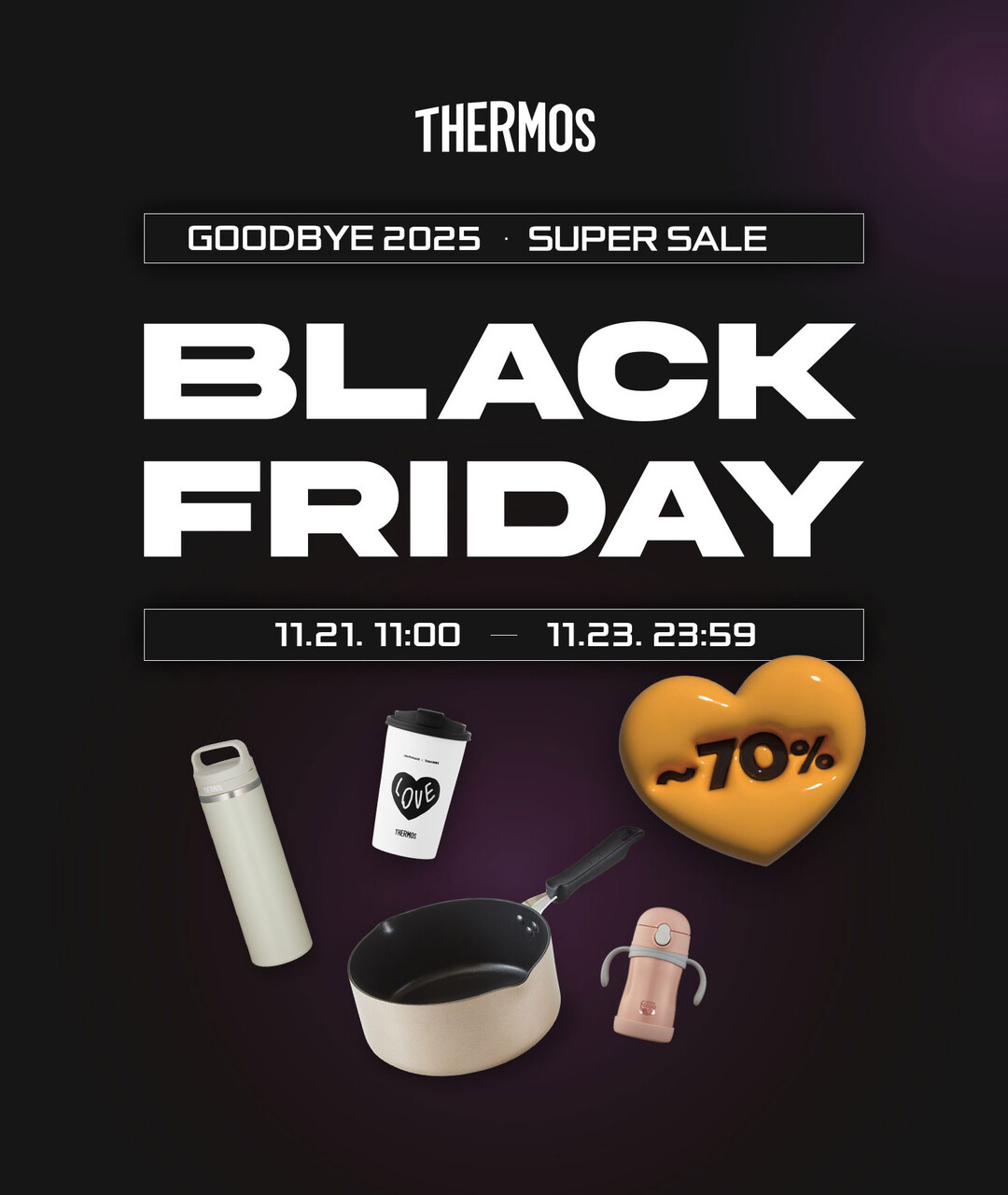 글로벌 보온병 브랜드 써모스가 11월 21일 오전 11시부터 23일까지 3일간 온라인 공식몰에서 전 품목을 대상으로 최대 70% 할인 혜택을 제공하는 ‘써모스 블랙 프라이데이’ 기획전을 진행한다.