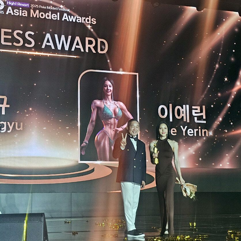 피트니스 모델 이예린이 강원도 정선군 하이원리조트에서 열린 '2025 아시아모델어워즈(Asia Model Awards 2025)'에서 피트니스 모델 부문을 수상, 머슬마니아 코리아 프로모터 겸 MAXQ(맥스큐) 발행인인 김근범 대표에게 트로피를 전달 받고 있다. 이예린은 세계선수권대회 비키니 피트니스 1위, 미스터&미스YMCA 비키니 피트니스 1위 등 국제·국내 대회에서 두각을 나타내며 모범적인 스포츠 정신을 높이 평가받았다.