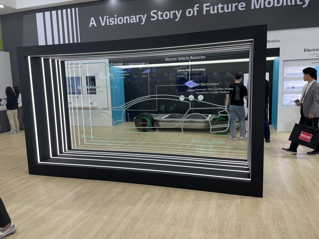 이어 LG전자와 마그나의 합작 기업인 엘지마그나 이파워트레인의 전기차 모터, 모듈, 인버터와 LG이노텍의 자율주행 모듈이 연달아 관람객들에 소개됐다. '미래 모빌리티에 대한 비전 스토리'라는 주제답게 LG 계열사들의 제품들로 전기차의 현재와 미래를 모두 확인할 수 있었다.
