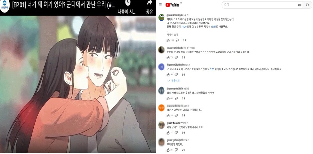 | ▲ 우리은행 금융교육 웹드라마 '차곡차곡 사랑하고 있습니다'에서 삭제된 오프닝 장면(왼쪽), 집게 손 모양 사용을 지적하는 누리꾼의 유튜브 댓글. 자료=유튜브 캡처 |