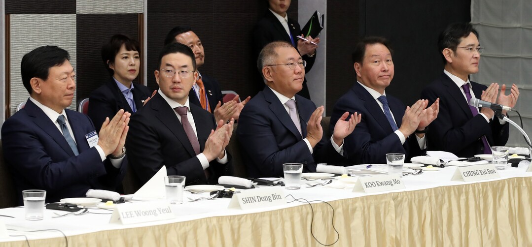 | ▲지난해 3월 일본 도쿄 게이단렌 회관에서 열린 한일 비즈니스 라운드테이블. 왼쪽부터 신동빈 롯데그룹 회장, 구광모 LG그룹 회장, 정의선 현대자동차그룹 회장, 최태원 SK그룹 회장, 이재용 삼성전자 회장. 사진=뉴시스 |