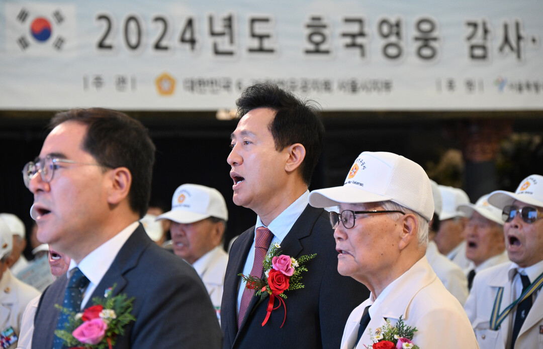 | ▲ 오세훈 서울시장이 6·25전쟁 참전유공자 위로연에서 애국가를 부르고 있다. 사진=서울시 |