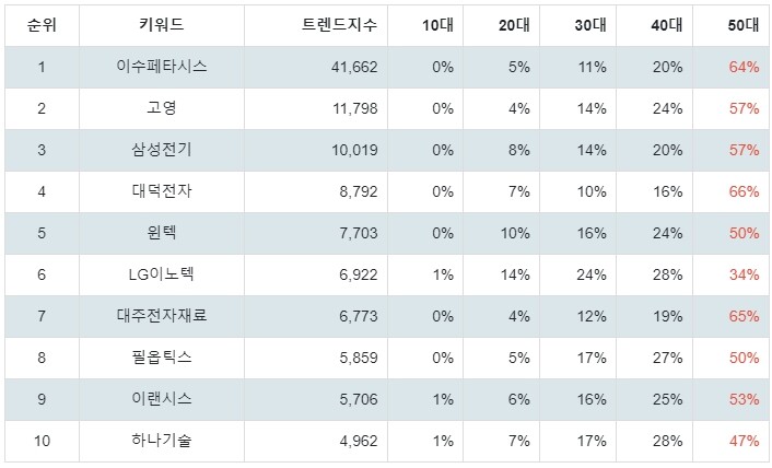연령별 선호도에서 이수페타시스 주가는 10대 0%, 20대 5%, 30대 11%, 40대 20%, 50대 64%로 나타났다.