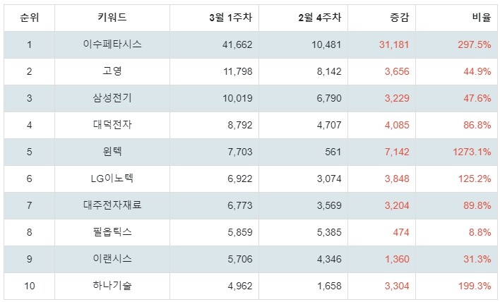 1위 이수페타시스 주가는 트렌드지수 41,662점으로 전주 10,481점보다 31,181점 상승했다.