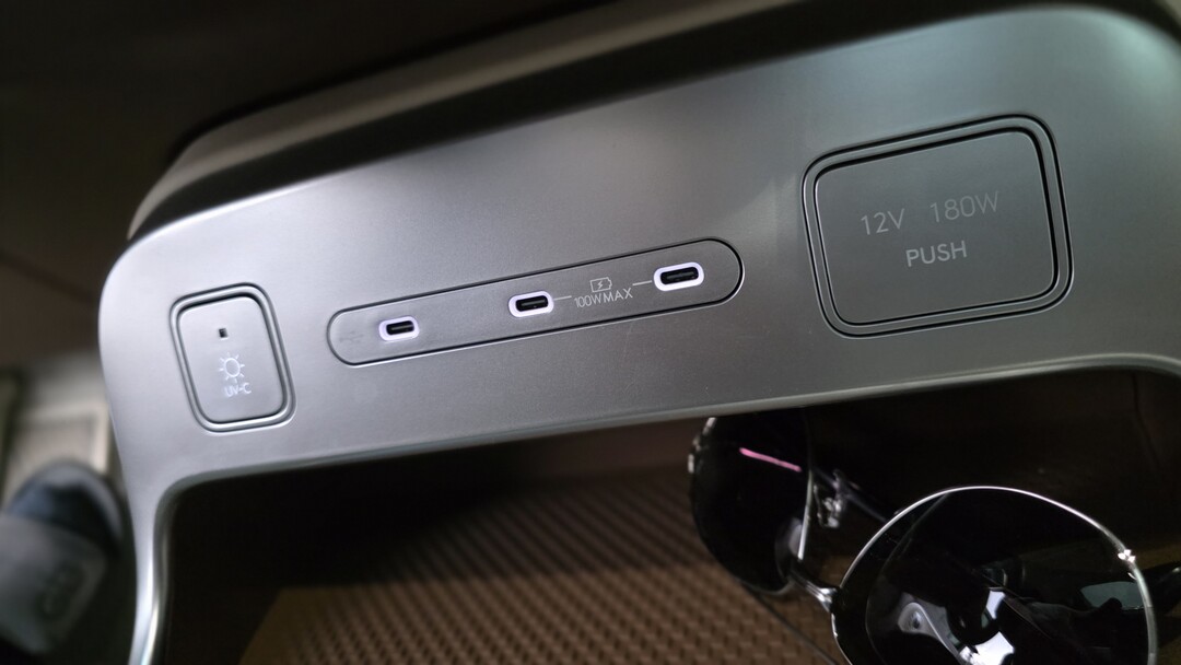 충전 편의성 또한 탁월했습니다. 100W 출력의 고속 충전 단자 6개를 포함한 총 8개의 충전 단자와 시가잭 단자, 그리고 운전석과 조수석 스마트폰 무선 충전기 2개가 적용되어 다양한 기기들을 동시에 충전할 수 있었어요. UV-C 살균 기능을 내장한 프런트 콘솔은 위생까지 세심하게 고려한 흔적이 엿보였습니다.