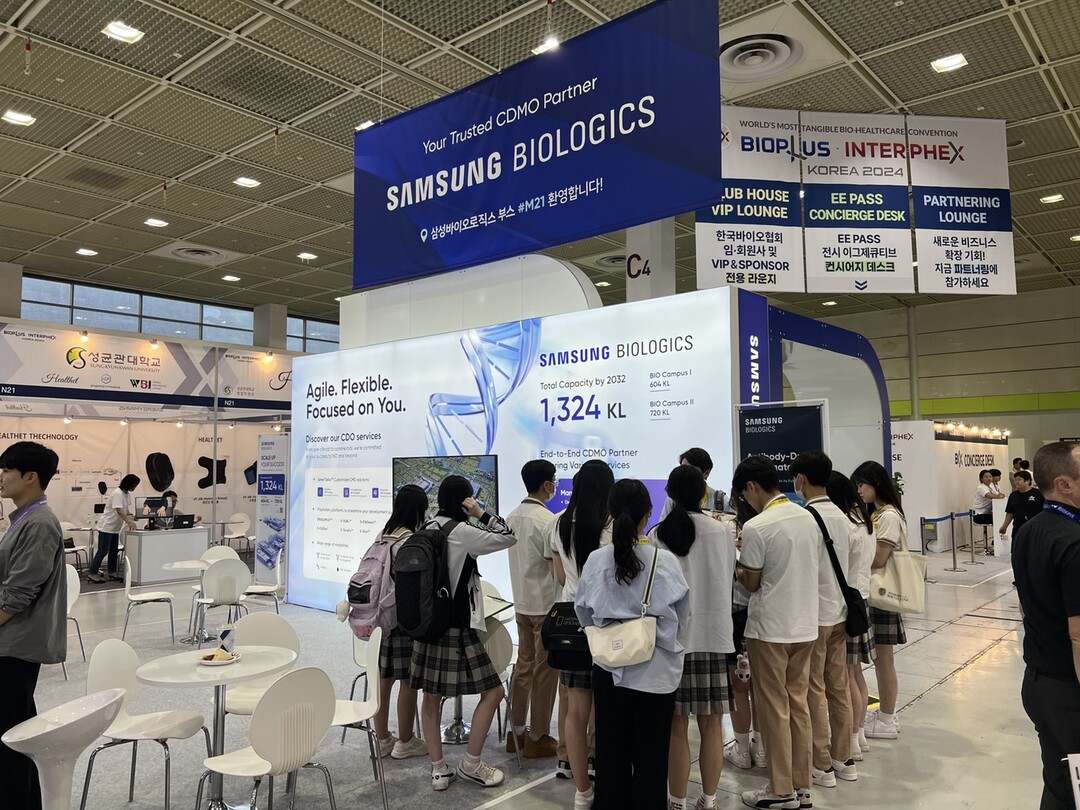 [CWN 손현석 기자] ‘바이오플러스-인터펙스 코리아 2024’(BIX 2024)에 참가한 삼성바이오로직스가 전시장 내 단독 부스를 설치한 가운데 경북바이오마이스터고등학교 학생들이 삼바 관계자로부터 중점사업 관련 설명을 듣고 있다.
