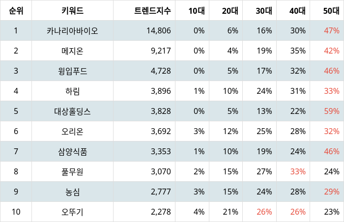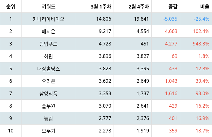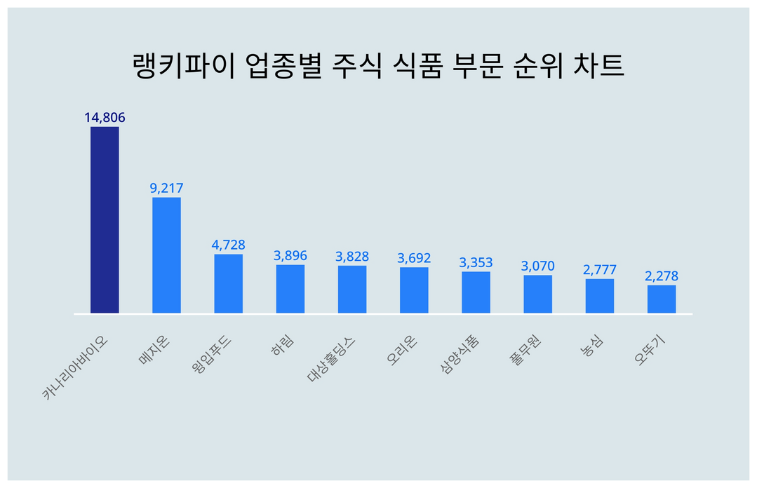 또 6위 오리온 주가는 트렌드지수 3,692점, 7위 삼양식품 주가는 트렌드지수 3,353점, 8위 풀무원 주가는 트렌드지수 3,070점, 9위 농심 주가는 트렌드지수 2,777점, 10위 오뚜기 주가는 트렌드지수 2,278점이다.