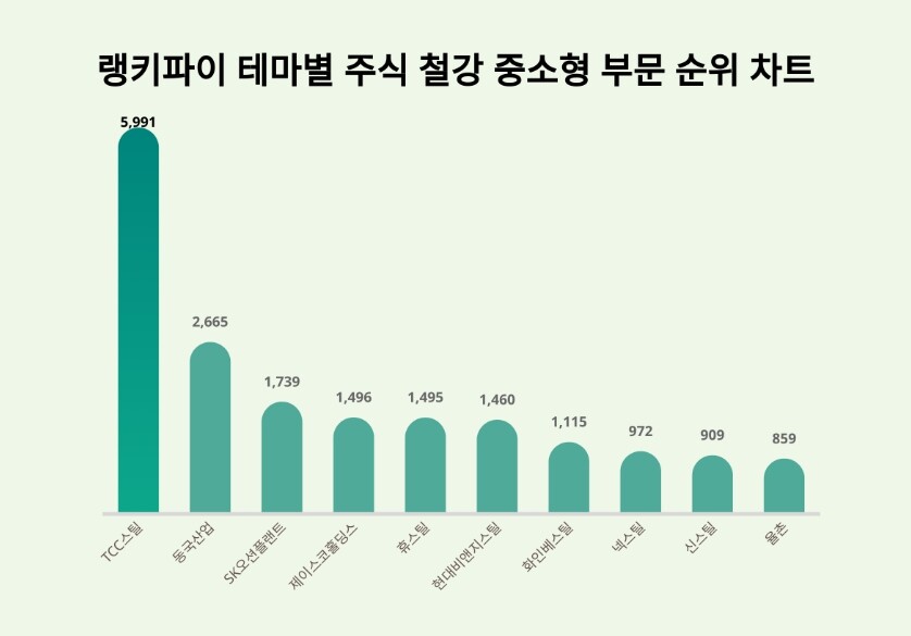 | ▲출처: 랭키파이 테마별 주식 철강 중소형 부문 트렌드 테이블 |