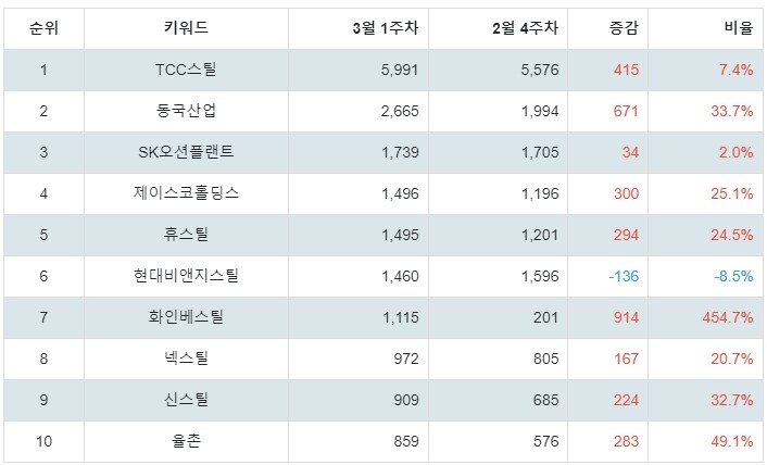 또 6위 현대비앤지스틸 주가는 트렌드지수 1,460점, 7위 화인베스틸 주가는 트렌드지수 1,115점, 8위 넥스틸 주가는 트렌드지수 972점, 9위 신스틸 주가는 트렌드지수 909점, 10위 율촌 주가는 트렌드지수 859점이다.