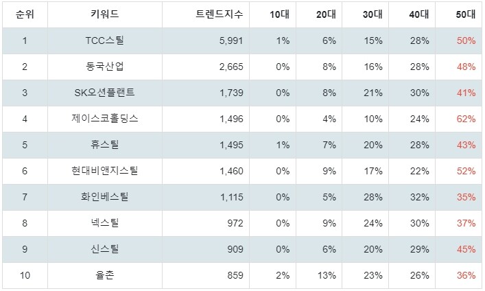 연령별 선호도에서 TCC스틸 주가는 10대 1%, 20대 6%, 30대 15%, 40대 28%, 50대 50%로 나타났다.
