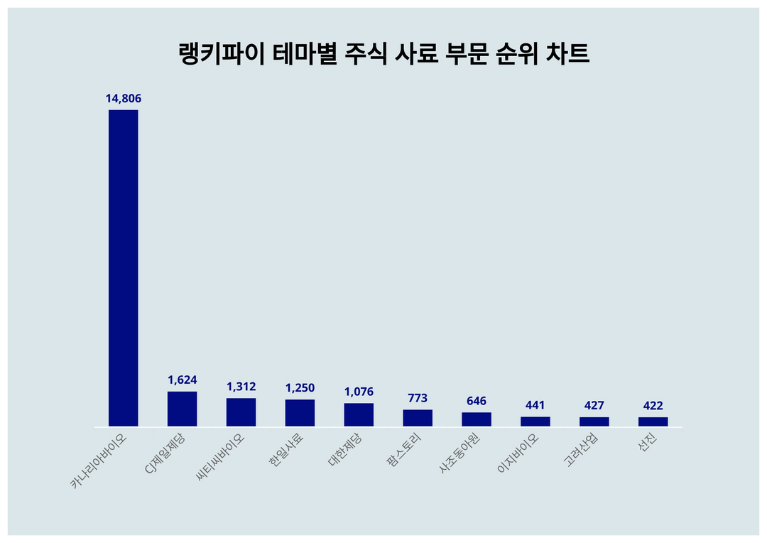 [CWN 김해남 기자] 랭키파이가 발표한 2024년 3월 2주차 트렌드지수 분석 결과 테마별 주식 사료 부문 트렌드지수에서 카나리아바이오 주가가 1위를 차지했다.