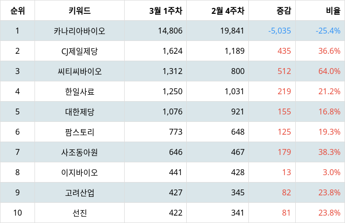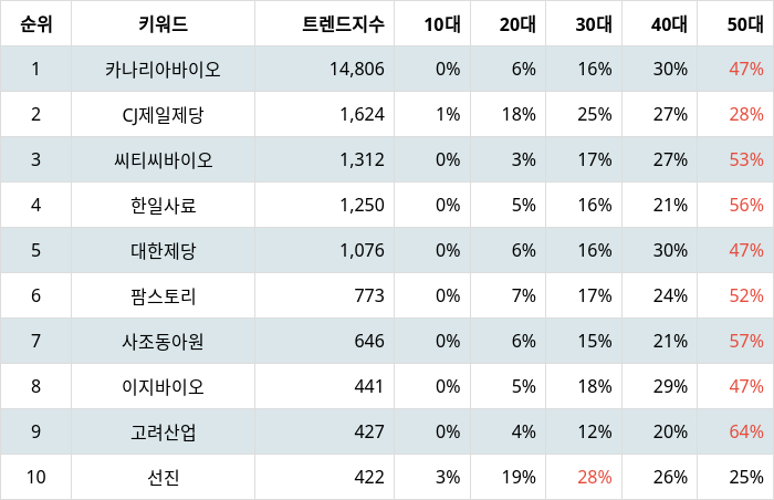 또 6위 팜스토리 주가는 트렌드지수 773점, 7위 사조동아원 주가는 트렌드지수 646점, 8위 이지바이오 주가는 트렌드지수 441점, 9위 고려산업 주가는 트렌드지수 427점, 10위 선진 주가는 트렌드지수 422점이다.