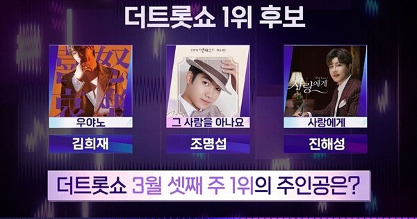 ‘더 트롯쇼’ 1위 후보곡은 김희재의 신곡 ‘우야노’, 진해성의 ‘사랑에게’, 1위 후보 부상한 조명섭의 ‘그 사람을 아나요’가 선정됐다.