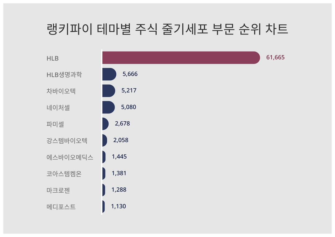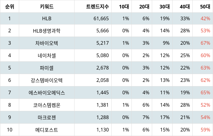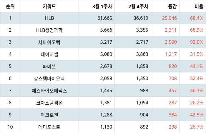1위 HLB 주가는 트렌드지수 61,665점으로 전주 36,619점보다 25,046점 상승했다.