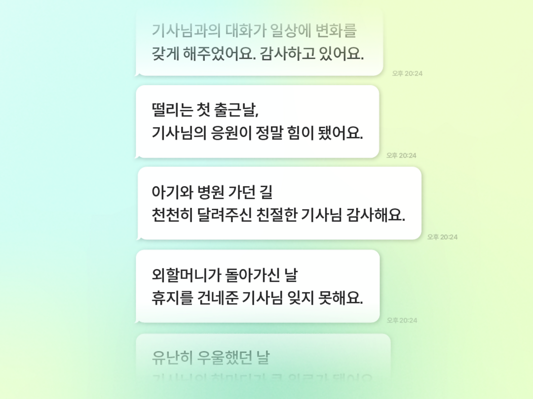 1만여건에 달하는 승객들의 감사 메시지는 이번 전달 이벤트를 통해 카카오 T 택시기사 앱에서 공개됐다.