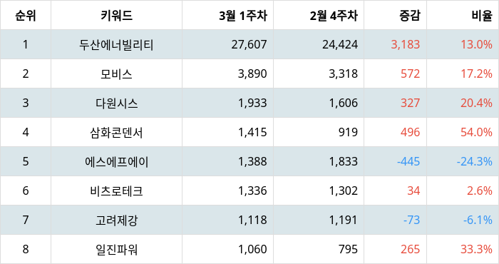1위 두산에너빌리티 주가는 트렌드지수 27,607점으로 전주 24,424점보다 3,183점 상승했다.