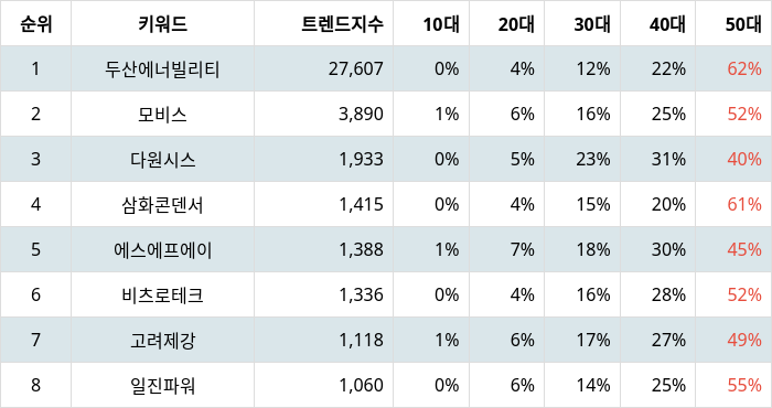연령별 선호도에서 두산에너빌리티 주가는 10대 0%, 20대 4%, 30대 12%, 40대 22%, 50대 62%로 나타났다.