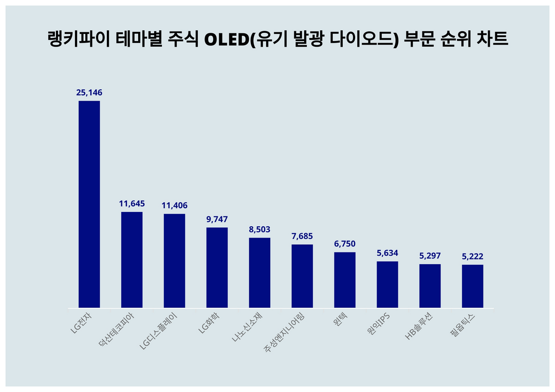 이는 랭키파이 빅데이터를 분석한 테마별 주식 OLED(유기 발광 다이오드) 부문 트렌드지수 2024년 3월 1주차 지표이다.
