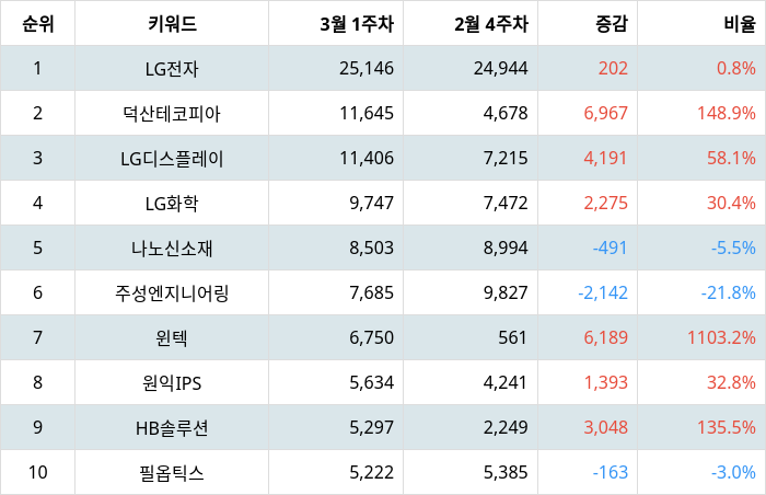 LG디스플레이 주가는 트렌드지수 11,406점으로 전주보다 4,191점 상승해 3위를 차지했다.