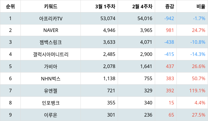1위 아프리카TV 주가는 트렌드지수 53,074점으로 전주 54,016점보다 942점 하락했다.
