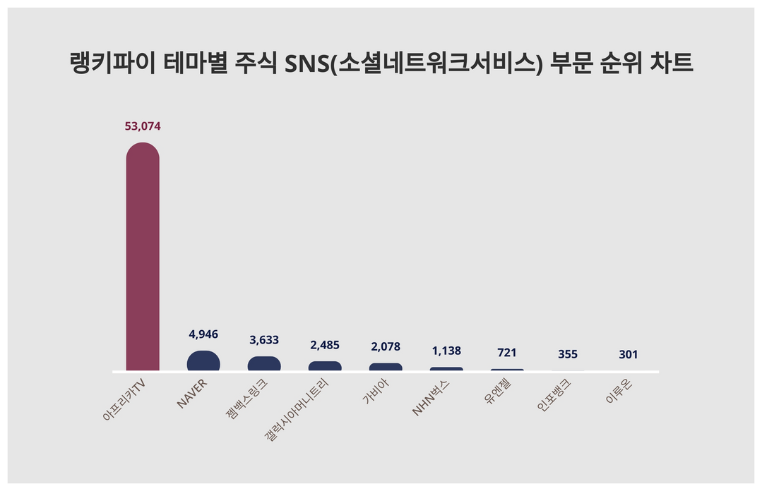 [CWN 김해남 기자] 랭키파이가 발표한 2024년 3월 2주차 트렌드지수 분석 결과 테마별 주식 SNS(소셜네트워크서비스) 부문 트렌드지수에서 아프리카TV 주가가 1위를 차지했다.