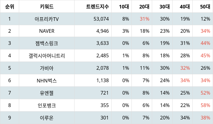 연령별 선호도에서 아프리카TV 주가는 10대 8%, 20대 31%, 30대 30%, 40대 19%, 50대 12%로 나타났다.