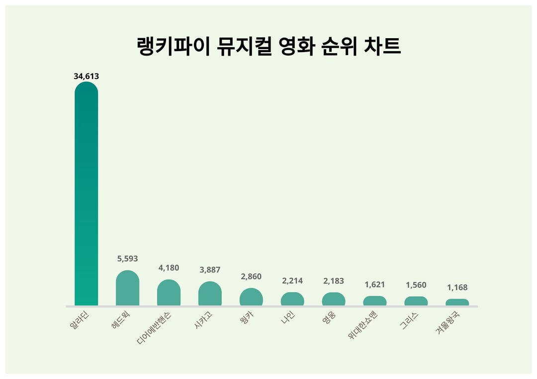 [CWN 김해남 기자] 랭키파이가 발표한 2024년 4월 4주차 뮤지컬 영화 트렌드 지수에 따르면 알라딘의 트렌드 지수는 34,613포인트로 전주보다 1,372포인트 상승해 1위를 차지했다.