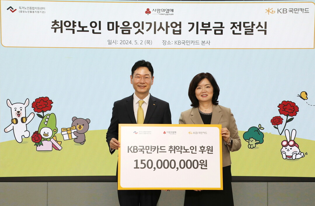 [CWN 권이민수 기자] KB국민카드가 5월 가정의 달을 맞아 독거노인종합지원센터에 후원금 1억5000만원을 전달하며 취약 노인 지원에 나섰다.