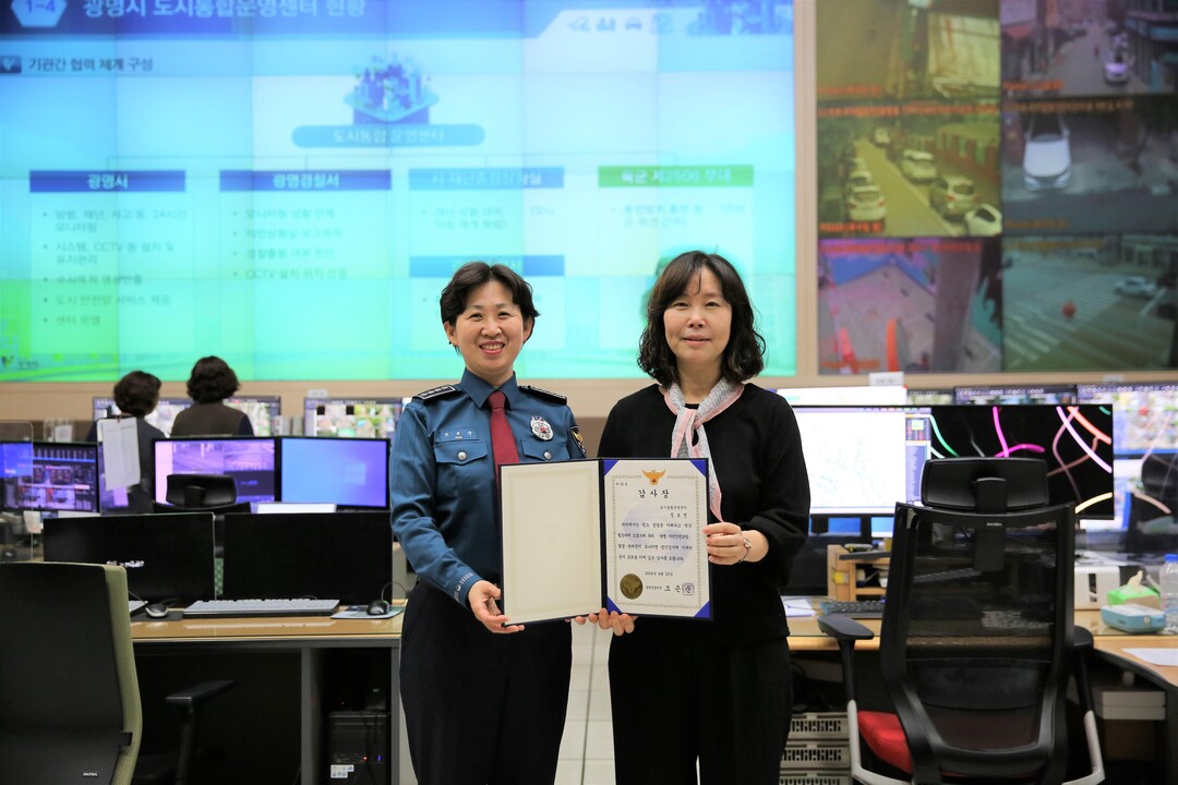 [CWN 정수희 기자] 경기 광명경찰서는 지난 25일 광명시 도시통합운영센터를 방문해 차량털이범을 검거하는 데 결정적인 역할을 한 관제요원에게 감사장을 수여하고 격려했다고 28일 밝혔다.