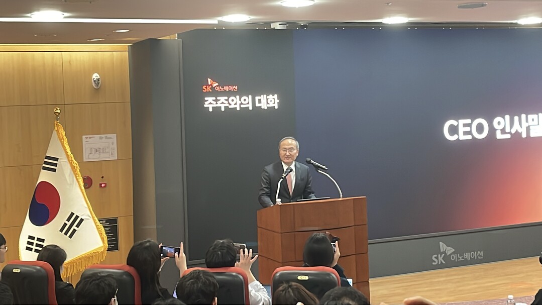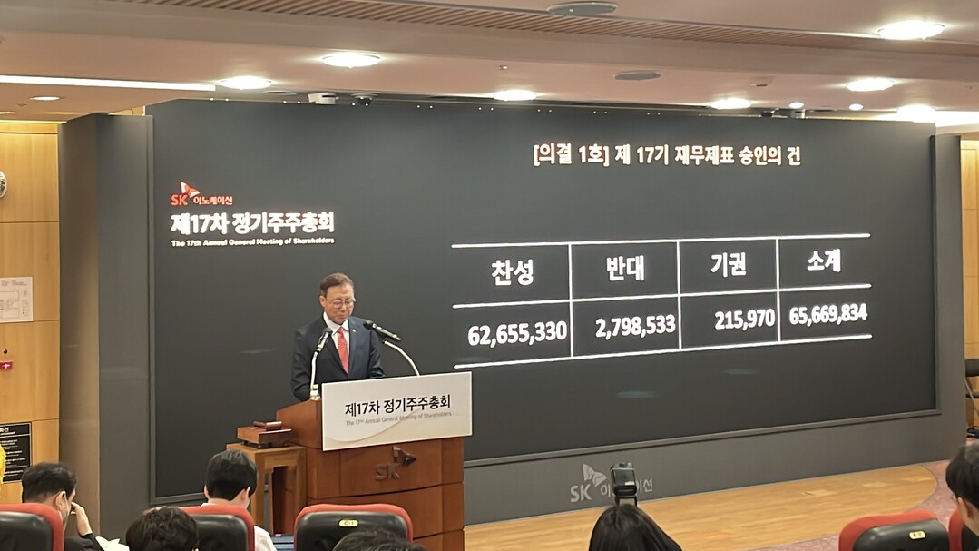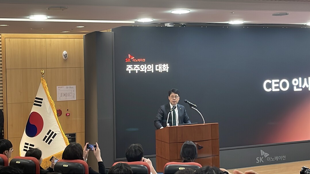 ▲ 28일 SK이노베이션이 서울 종로구 SK서린빌딩에서 제17기 정기주주총회를 개최했다. 이석희 SK온 대표이사 사장이 인사말을 전하고 있다. 사진=김정후 기자