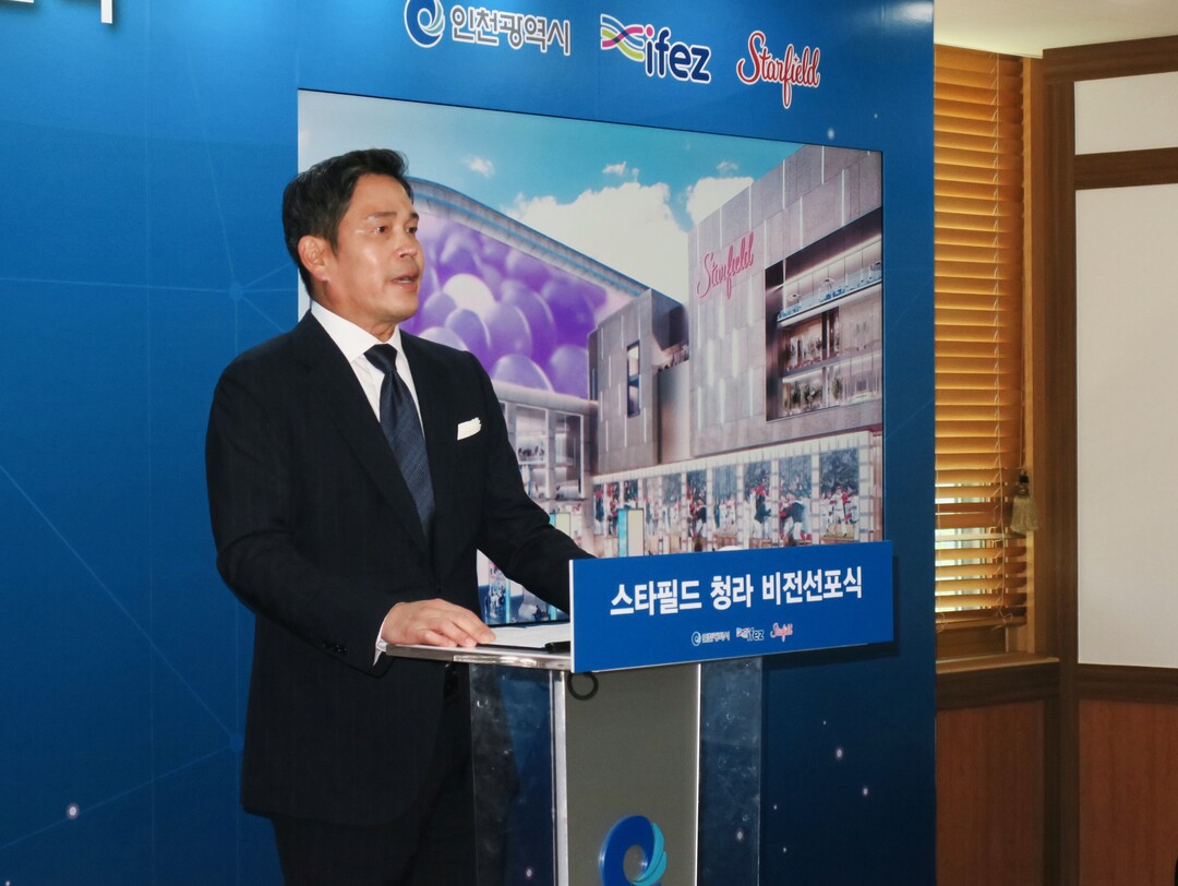 ▲ 지난해 6월 정용진 신세계그룹 부회장이 인천 남동구 인천시청에서 스타필드청라 사업계획 브리핑 및 멀티스타디움 건립 비전 선포식에 참석해 축사를 하고 있는 모습. 사진=뉴시스