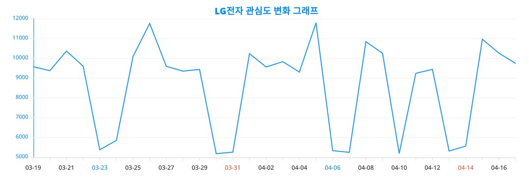 이번 분석을 통해 얻어진 LG전자에 대한 일간 변화 추이 차트는, LG전자에 대한 관심이 어떻게 변화했는지를 생생하게 드러낸다.