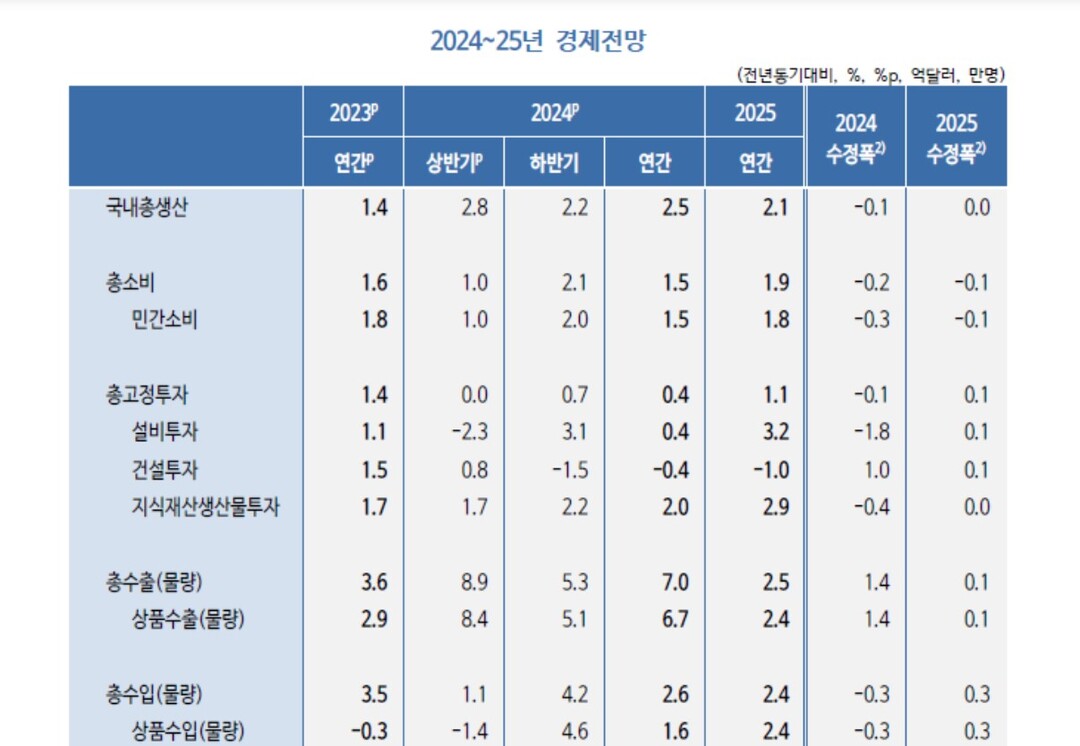 민간소비는 고금리 기조 장기화를 반영해 기존 전망(1.8%)보다 낮은 1.5% 증가할 것으로 내다봤다.