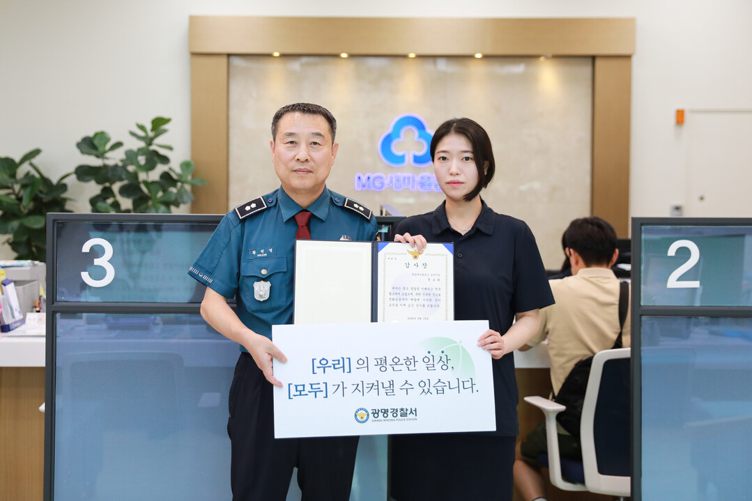 [CWN 정수희 기자] 경기 광명경찰서는 지난 19일 투자리딩방 사기 피해를 예방한 광남새마을금고 소하지점 은행원에게 감사장을 수여했다고 20일 밝혔다.