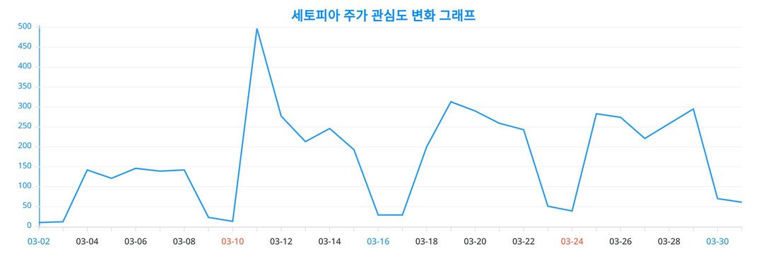 또한, 세토피아 주가에 대한 일간 변화 추이를 보여주는 차트는 세토피아 주가에 대한 관심이 어떻게 변화하고 있는지를 상세하게 보여준다.