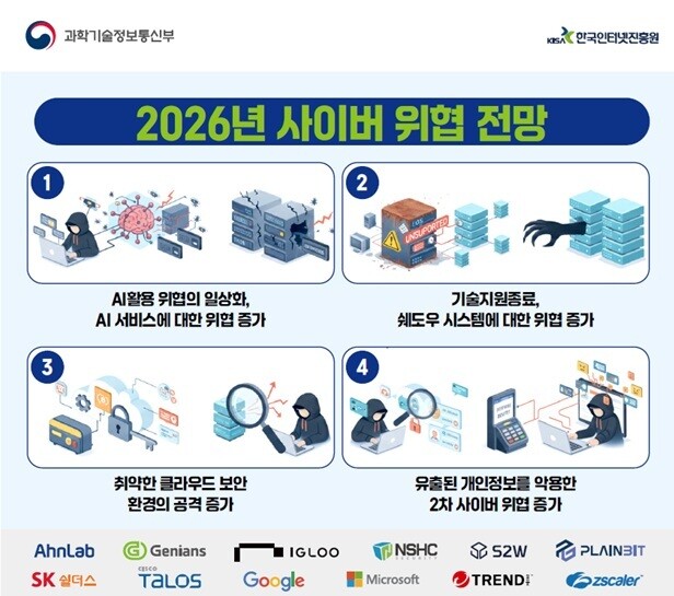 과기정통부는2026년 예상되는 사이버 위협 4가지 주제를 제시했다. ▲AI 기반 사이버 공격 증가 ▲서비스 종료 시스템 및 미사용 시스템 해킹 우려 ▲클라우드 환경의 취약 요소 공격 증가 ▲ 유출된 개인정보의 2차 사이버 위협 등이 위협 요소로 제기됐다.