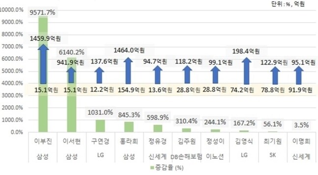 이 사장은 2013년에 삼성SDS 지분 3.9%에 대한 배당금 15억1000만원을 받았으나 이후 상속에 따른 삼성전자, 삼성물산, 삼성생명 등 지분에 대한 배당이 반영돼 2023년 기준 9571.7% 증가한 1460억원을 받는 것으로 집계됐다.