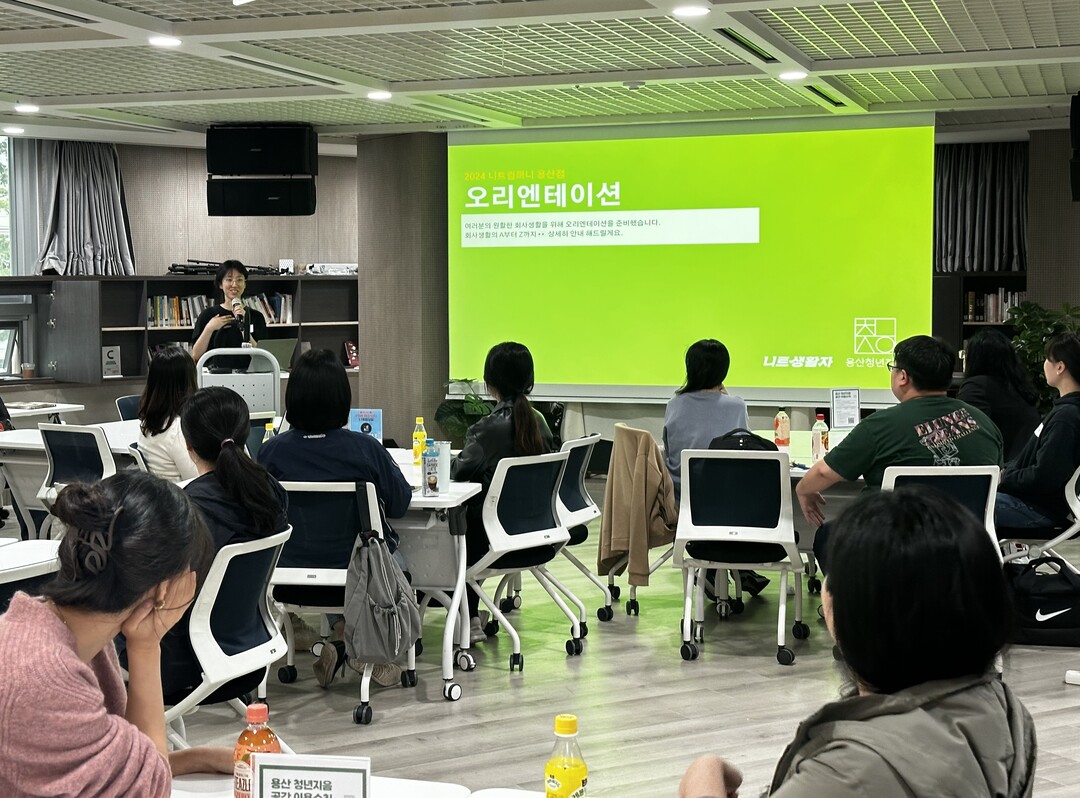 | ▲ 지난 19일 니트컴퍼니 입사자들이 오리엔테이션에 참석한 모습. 사진=용산구 |