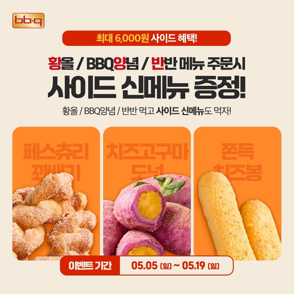 또한 BBQ는 오늘(3일) 가정의 달을 맞아 온 가족이 간식과 안주로 즐기기 좋은 사이드 메뉴를 출시했다. 새롭게 선보인 신메뉴는 '쫀득 치즈봉(크런치버터맛·치즈맛)'과 '치즈고구마 도넛', '페스츄리 꽈배기' 3종이다.