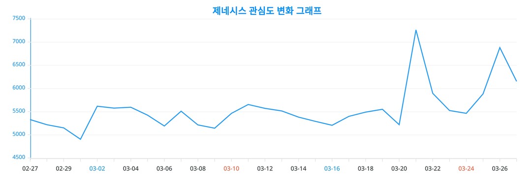 또한, 제네시스에 대한 일간 변화 추이를 보여주는 차트는 제네시스에 대한 관심이 어떻게 변화하고 있는지를 상세하게 보여준다.