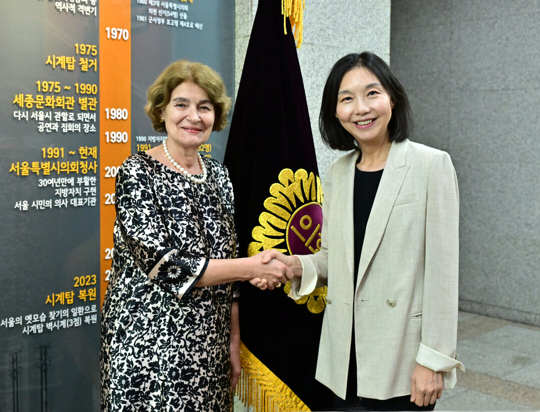 | ▲ 최호정 서울시의회 의장(오른쪽)이 이리나 보코바 전 유네스코 사무총장과 만나 악수를 나누고 있다. 사진=서울시의회 |