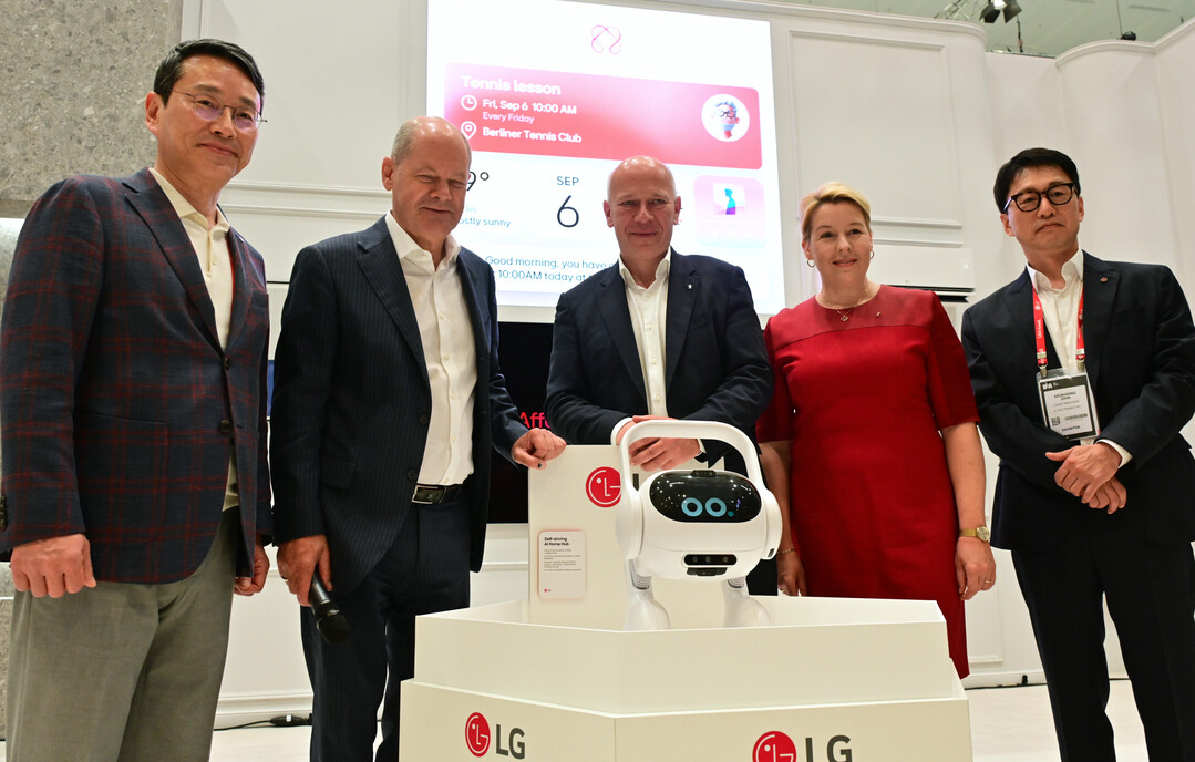 ▲올라프 숄츠 독일 총리가 베를린에서 열리고 있는 'IFA 2024' LG전자 전시관을 방문했다. 왼쪽부터 조주완 CEO, 올라프 숄츠 독일 총리, 카이 베그너 베를린 시장, 프란치스카 기페이 베를린 상원의원. 사진=LG전자