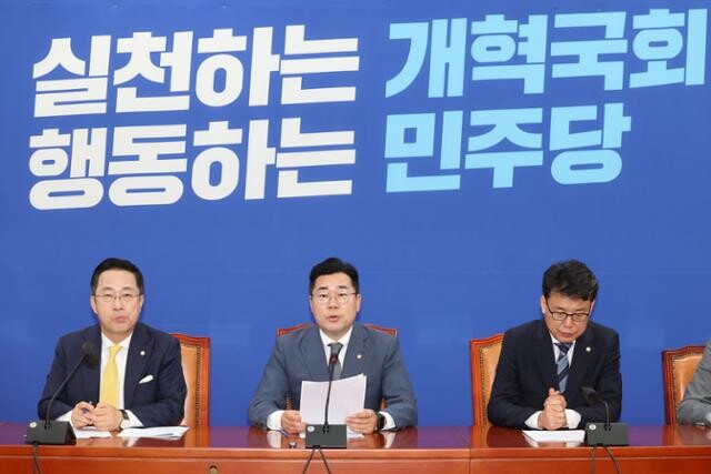 | ▲ 박찬대(가운데) 더불어민주당 대표 권한대행 겸 원내대표가 11일 서울 여의도 국회에서 열린 정책조정회의에서 발언하고 있다. 사진=뉴시스 |